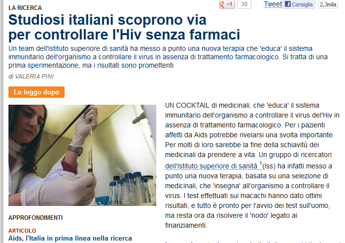 Lo dice Repubblica, già dalla prima frase del suo articolo: “Un cocktail di medicinali, che ‘educa’ il sistema immunitario dell’organismo a controllare il virus dell’Hiv in assenza di trattamento farmacologico“. Medicine usate per curare senza medicine. Semplice, no?