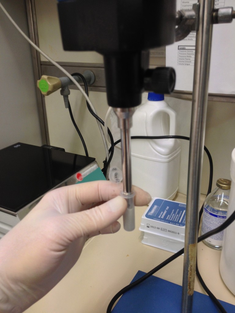 L’operazione nel dettaglio: per accomodare il tutto ho utilizzato un becker pieno di ghiaccio. Oltre a permettermi di posizionare correttamente la provetta rispetto alla punta di metallo, il tutto rimane al freddo, impedendo così che le proteine in via di estrazione si scaldino troppo.